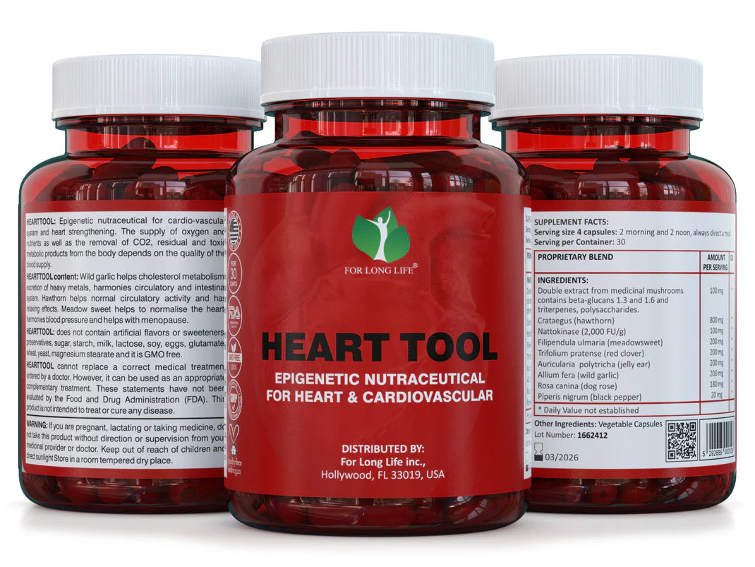 The integrity of the cardiovascular system relies on both the purity of blood and the elasticity of blood vessels. Scientific literature has shown that vascular aging is linked not only to lifestyle but also to a gradual accumulation of plaque, toxins, and oxidative stress. HEARTTOOL incorporates a blend of phytonutrients known for their antioxidant, anti-inflammatory, and vascular-protective effects. These may assist in reducing the buildup of lipids and supporting endothelial function. As an epigenetic nutraceutical, it also includes ingredients that may influence gene regulation pathways involved in vascular tone, inflammation, and detoxification—offering a multi-layered approach to cardiovascular health rooted in systems biology.